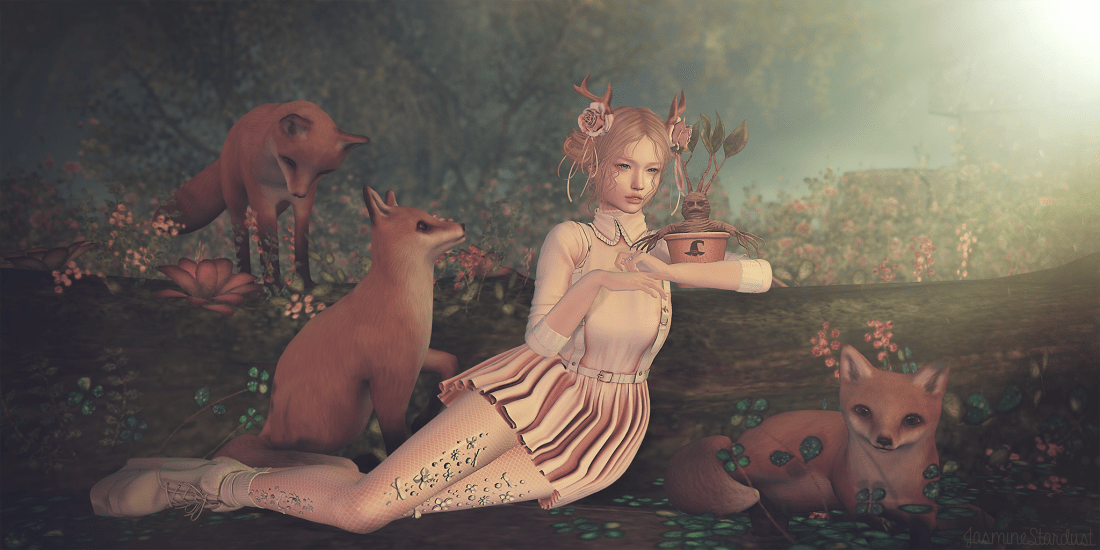 Lace choker by Kotte. Stockings are by Astralia. Cute foxes are by Half Deer at The Epiphany event. Decorations around me are by HPMD, Anc and Fanatik. Pose by FoxCity.